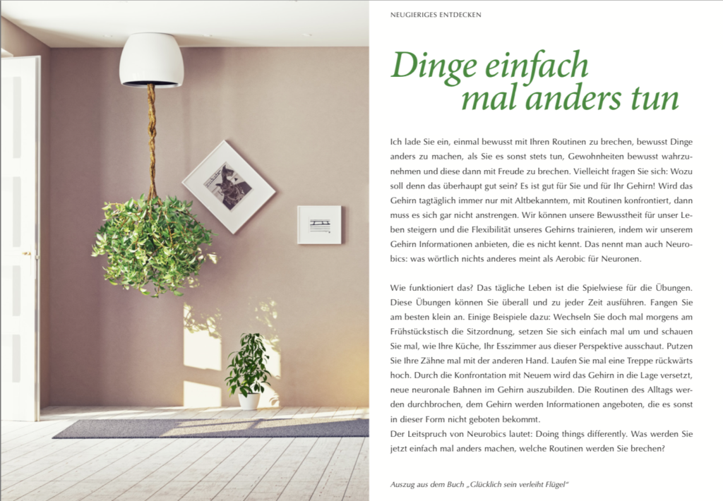 Vielleicht fragen Sie sich: Wozu soll denn das überhaupt gut sein? Es ist gut für Sie und für Ihr Gehirn! Wird das Gehirn tagtäglich immer nur mit Altbekanntem, mit Routinen konfrontiert, dann muss es sich gar nicht anstrengen.