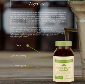 Für die ganz Interessierten gibt es ein ganz wertvolles, hochwirksames Algenprodukt, welches uns immer beim Entgiften hilfreich zur Seite steht: Ethno-Health Algenkraft