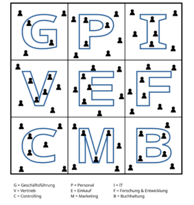 Jedes Kästchen steht für eine Abteilung und die Buchstaben symbolisieren die Abteilungsstrukturen. Je mehr Mitarbeiter einer Abteilung einen großen Teil ihrer Energie in die Struktur einbringen, desto effizienter ist die gesamte Arbeitsleistung. Die Mitarbeiter außerhalb der Strukturen symbolisieren eine unterdurchschnittliche Arbeitsleistung. Ein bedeutender Teil deren Energie wird für andere interne aber auch externe Schauplätze aufgewendet. Je deutlicher die Inkohärenz in einer Abteilung ist, desto ineffizienter wird gearbeitet und desto mehr Kapital wird vernichtet.