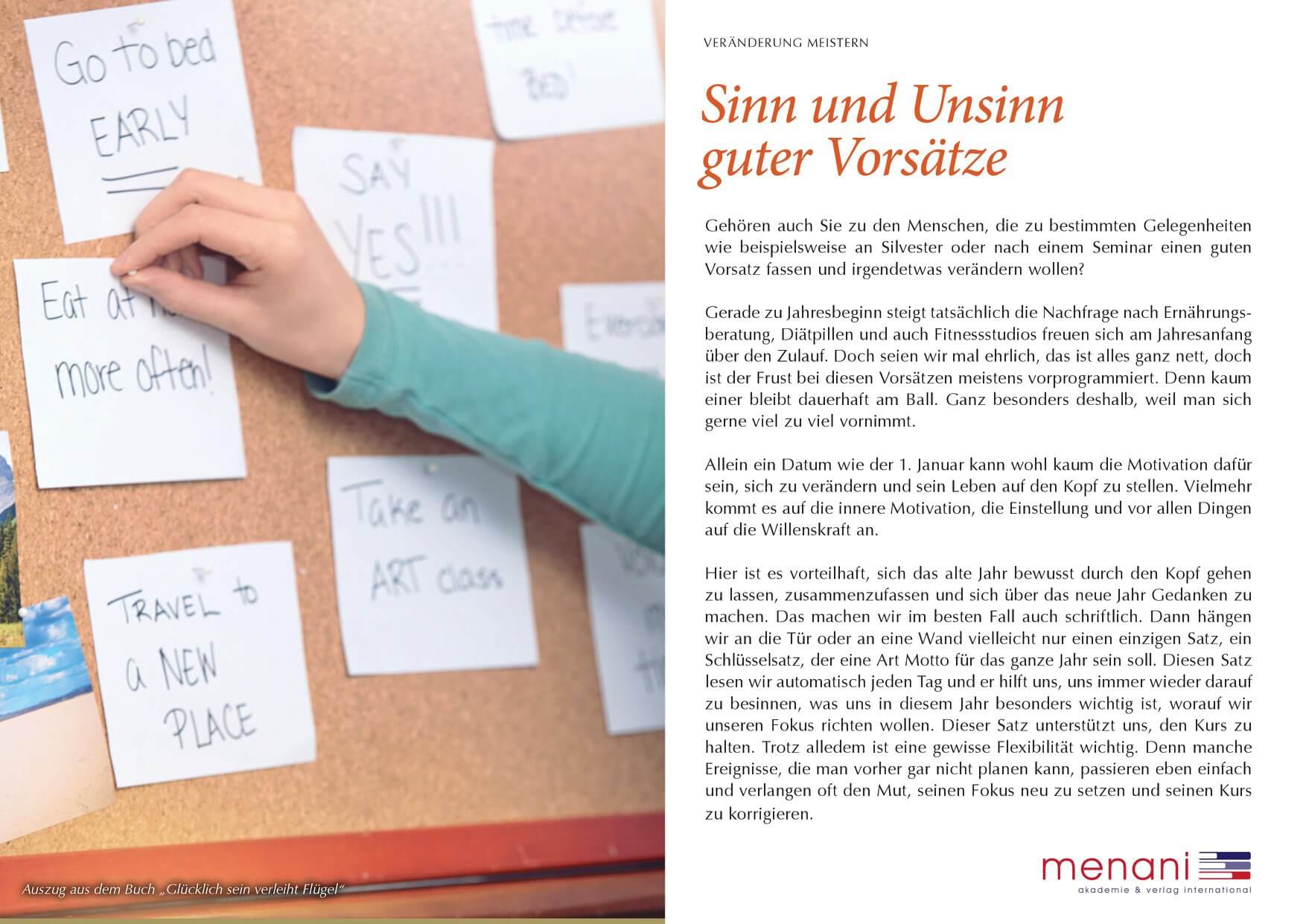 Hier ist es vorteilhaft, sich das alte Jahr bewusst durch den Kopf gehen zu lassen, zusammenzufassen und sich über das neue Jahr Gedanken zu machen. Das machen wir im besten Fall auch schriftlich. Dann hängen wir an die Tür oder an eine Wand vielleicht nur einen einzigen Satz, ein Schlüsselsatz, der eine Art Motto für das ganze Jahr sein soll. Diesen Satz lesen wir automatisch jeden Tag und er hilft uns, uns immer wieder darauf zu besinnen, was uns in diesem Jahr besonders wichtig ist, worauf wir unseren Fokus richten wollen. Dieser Satz unterstützt uns, den Kurs zu halten.