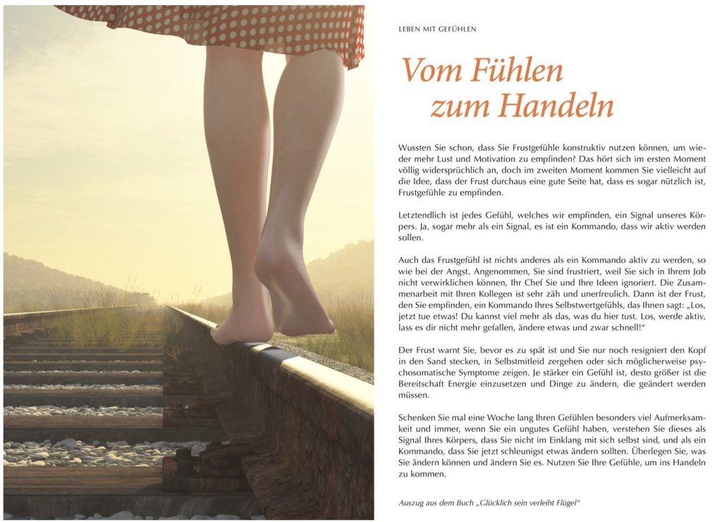 Auch das Frustgefühl ist nichts anderes als ein Kommando aktiv zu werden, so wie bei der Angst. Angenommen, Sie sind frustriert, weil Sie sich in Ihrem Job nicht verwirklichen können, Ihr Chef Sie und Ihre Ideen ignoriert. Die Zusammenarbeit mit Ihren Kollegen ist sehr zäh und unerfreulich. Dann ist der Frust, den Sie empfinden, ein Kommando Ihres Selbstwertgefühls, das Ihnen sagt: „Los, jetzt tue etwas! Du kannst viel mehr als das, was du hier tust. Du hast es verdient, von deinem Chef fair behandelt zu werden. Jetzt überlege dir, was du wie verändern kannst, damit du zeigen kannst, was in dir steckt. Los, werde aktiv, lass es dir nicht mehr gefallen, ändere etwas und zwar schnell!“