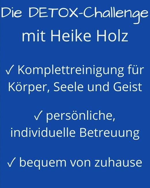 Dann sehen wir uns am 2. Januar / 18. Februar zum Entlastungstag – danach live an weiteren 5 Abenden (02. / 03. / 04. / 06. / 08. / 11. Januar) bzw. (18. / 19. / 20. / 22. / 24. / 27. Februar) um 18.00 Uhr für eine Stunde über Zoom – den Anmelde-Link erhältst du einige Tage zuvor. Hier könnt ihr Fragen stellen und von eurer Erfahrung erzählen. Ich habe tägliche Themen, mit denen ich euch vertraut machen möchte. Außerdem werden wir auch durch von mir geführte Meditationen „Mind&Soul-Detox“ erleben.