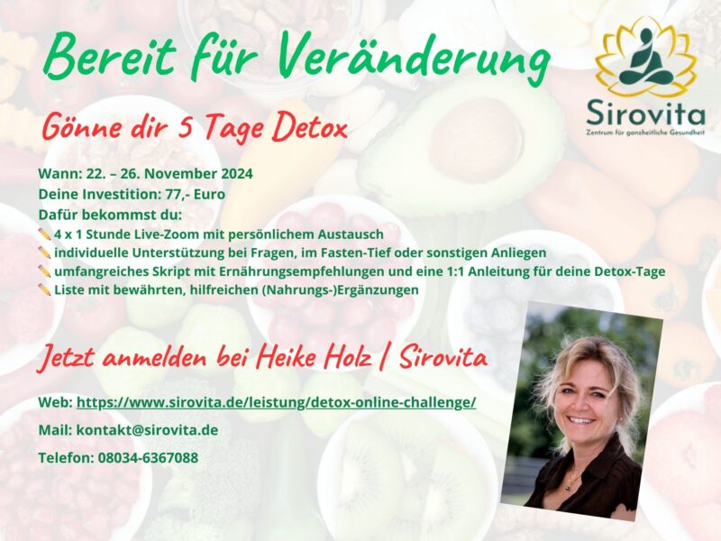 Ich kann Detoxfasten mit Heike Holz uneingeschränkt empfehlen! Fasten in der Gruppe ist viel einfacher als alleine, und die regelmäßigen Teamcalls mit interessanten Themen und Infos von Heike sind sehr hilfreich und informativ, auch für die Zeit nach dem Fasten. Ich würde das jederzeit wieder machen, und ich werde auch sicher und gerne nochmal dabei sein. Danke an die Gruppe und vor allem an Heike!